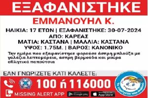 Σύμφωνα με το «Χαμόγελο του Παιδιού» για την εξαφάνιση, τα ίχνη του Εμμανουήλ Κ. 17 ετών χάθηκαν στις 30 Ιουλίου, μεσημεριανές ώρες, από τον Καρέα.