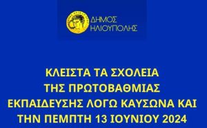 Ο Δήμος Ηλιούπολης κατόπιν απόφασης του Δημάρχου Στάθη Ψυρρόπουλου, ανακοινώνει ότι και την Πέμπτη 13 Ιουνίου 2024, τα σχολεία της Πρωτοβάθμιας Εκπαίδευσης σε όλες τις σχολικές μονάδες (Νηπιαγωγεία, Δημοτικά Σχολεία) εντός των διοικητικών ορίων του Δήμου θα παραμείνουν κλειστά λόγω Καύσωνα.
