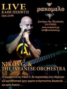 Κάθε Πέμπτη, στις 21:00, η Αυτού Καραφλώτης, Νίκος Γκιόλιας και η εκπληκτική Γιαπωνέζικη Μπάντα του, θα βρίσκονται στο Rakomelo να μας παίρνουν τ'αυτιά!!!