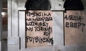 Έγραψε συνθήματα στο σπίτι της Αλεξίας Έβερτ η αναρχική συλλογικότητα «Ρουβίκωνας» μετά από το σχόλιο της για τους διαδηλωτές του ΚΚΕ που τίμησαν την επέτειο του Πολυτεχνείου χαρακτηρίζοντάς τους «τρωκτικά και κατσαρίδες».