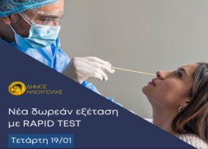 Την Τετάρτη 19 Ιανουαρίου 2022, από 09:00 έως 15:00, πραγματοποιείται μαζικός έλεγχος ταχείας ανίχνευσης «Covid-19 Rapid test», από την Περιφέρεια Αττικής σε συνεργασία με τον Ιατρικό Σύλλογο Αθηνών και τον Δήμο Ηλιούπολης, στο φουαγιέ του κλειστού θεάτρου του Δημαρχείου Ηλιούπολης, με είσοδο από την οδό Κουντουριώτου.