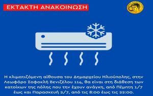 Η κλιματιζόμενη αίθουσα του Δημαρχείου Ηλιούπολης, στην Λεωφόρο Σοφοκλή Βενιζέλου 114, θα είναι στη διάθεση των κατοίκων της πόλης που την έχουν ανάγκη, από Πέμπτη 1/7 έως και Παρασκευή 2/7, από τις 8:00 έως τις 22:00.