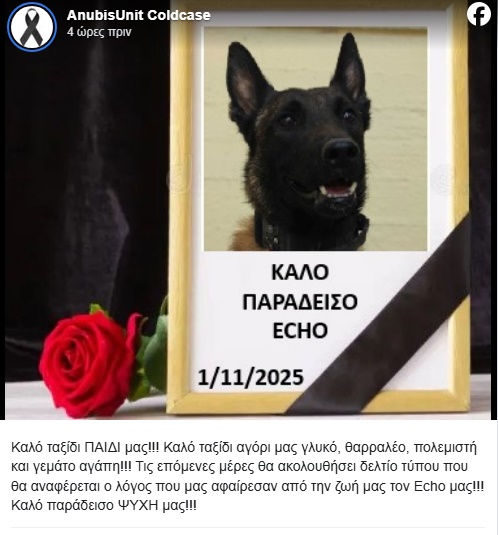 Με μια λιτή ανάρτηση στα Μέσα Κοινωνικής Δικτύωσης, η ομάδα «Αnubis» που με τους ειδικά εκπαιδευμένους σκύλους έχει συμμετάσχει σε πολλές αναζητήσεις αγνοουμένων αλλά και σε πολύκροτες υποθέσεις όπως τα Τέμπη, αυτή του Βασίλη Καλογήρου και του Μπάμπη Κούτσικου, ενημερώνει πως ο θρυλικός σκύλος – ντετέκτιβ «Εcho», πέθανε ξαφνικά.