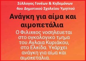Ο Φίλιππος είναι δικό ΜΑΣ παιδί (Ανάγκη για αίμα και αιμοπετάλια) - Σύλλογος Γονέων και Κηδεμόνων 4ου Δημοτικού Σχολείου Υμηττού Στα πέριξ 03 Ιουνίου 2022 Σύλλογος Γονέων & Κηδεμόνων 4ου Δημοτικού Σχολείου ΥμηττούΟ Φίλιππος είναι δικό ΜΑΣ παιδί!Η οικογένεια του 4ου Δημοτικού Υμηττού, ας δείξει τη δύναμή της! Παρακαλούμε όλους να αφουγκραστείτε τη φωνή μας και να σταθούμε όλοι, ο καθένας με τον τρόπο του, στην ίδια αλυσίδα αγάπης! Σας ευχαριστούμε!!! Όλα θα πάνε καλά!!www.facebook.com/syllogos4ymittou Σύλλογος Γονέων και Κηδεμόνων 4ου Δημοτικού Σχολείου Υμηττού αίμα αιμοπετάλια Ηλιούπολη Ηλιούπολη για όλους ilioupoli www.ilioupoligiaolous.gr Προβλήθηκε 963 φορές Δείτε Επίσης: Στα πέριξ Δείτε τα Όλα Γλυφάδας: 16χρονος πήγε στο σχολείο με τρία μαχαίρια - Συνελήφθη και ο πατέρας του 26 Ιανουαρίου 2026 Εκτός από τα τρία μαχαίρια, είχε στην κατοχή του και έναν κόφτη Γλυφάδα: Γιος δολοφόνησε με μαχαίρι τον πατέρα του και τον έβαλε στο πορτμπαγκάζ αυτοκινήτου - Είχε σκοτώσει τη μητέρα του το 2014 25 Ιανουαρίου 2026 Η αστυνομία έχει βρει το μαχαίρι με το οποίο ο 46χρονος αφαίρεσε τη ζωή του πατέρα του. Άλιμος: Άγριος ξυλοδαρμός 13χρονου από δέκα ανηλίκων - Του έσπασαν κόκκαλο κάτω από το μάτι, νοσηλεύεται στο ''Παίδων,'' 24 Ιανουαρίου 2026 Παρέα 10 παιδιών επιτέθηκαν με γροθιές στον 13χρονο, ο οποίος νοσηλεύεται στο Νοσοκομείο Παίδων «Αγλαΐα Κυριακού», στην χειρουργική κλινική με σπασμένο ζυγωματικό οστό κάτω από το μάτι Αγιος Δημήτριος: Αγνωστοι άνοιξαν πυρ κατά των ιδιοκτητών γνωστού σουβλατζίδικου - Στο νοσοκομείο πατέρας και γιος 12 Ιανουαρίου 2026 Σοβαρό επεισόδιο με πυροβολισμούς σημειώθηκε τα ξημερώματα της νύχτας στον Άγιο Δημήτριο. Φωτιά σε κατάστημα στη Νέα Σμύρνη 04 Ιανουαρίου 2026 Καταστράφηκε ολοσχερώς Καισαριανή: Εμπρηστική επίθεση με στόχο εταιρεία διανομών, κάηκαν συνολικά επτά οχήματα 29 Δεκεμβρίου 2025 Δεν εντοπίστηκε αυτοσχέδιος εκρηκτικός ή εμπρηστικός μηχανισμός, αλλά υπάρχουν ενδείξεις ότι στα φορτηγά είχε περιχυθεί εύφλεκτο υγρό Ταύρος: Ληστής ''μπούκαρε'' σε κατάστημα τυχερών παιχνιδιών, χτύπησε την υπάλληλο και έφυγε με 10.000 ευρώ 29 Δεκεμβρίου 2025 Ο δράστης αφού μαχαίρωσε στο χέρι την κοπέλα, στη συνέχεια την κλείδωσε μέσα σε γραφείο Κακοκαιρία: Εικόνες καταστροφής στον Άλιμο - Διαλύθηκε πρόσοψη πολυκατοικίας και άνδρας ανέβηκε στον ''ουρανό'' αυτοκινήτου 25 Δεκεμβρίου 2025 Οι κάτοικοι της γειτονιάς λένε ότι δεν είναι η πρώτη φορά που πλημμυρίζουν ωστόσο τέτοιο κακό δεν είχε ξαναγίνει