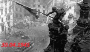 φωτογραφία: 30.04.1945: Ο επιλοχίας Μιχαήλ Α. Φ. Γιεγκόροφ και ο λοχίας Μελίτων Β. Καντάρια του Σοβιετικού Στρατού στήνουν την κόκκινη σημαία με το σφυροδρέπανο, τη Σημαία της Νίκης, πάνω από τον κεντρικό τρούλο του Ράιχσταγκ.