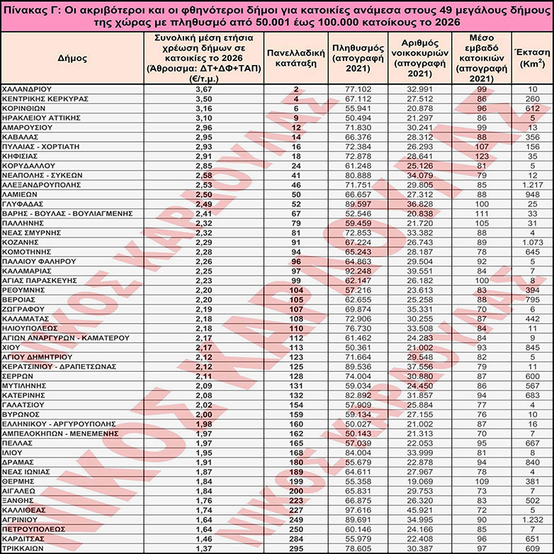 Στον πίνακα Γ που ακολουθεί απεικονίζεται η συνολική μέση ετήσια χρέωση σε κατοικίες των 49 μεγάλων Δήμων της χώρας, με πληθυσμό από 50.001 έως 100.000 κατοίκους το 2026.