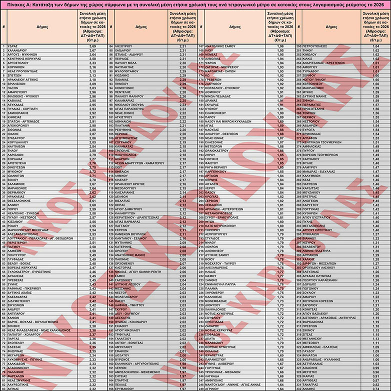 Λαμβάνοντας τους συντελεστές του ΔΦ και του ΤΑΠ για τα αστικά κέντρα όλων των Δήμων από τη «Διαύγεια», υπολογίσθηκε η συνολική μέση ετήσια χρέωση των Δήμων ανά τετραγωνικό μέτρο (τ.μ.) στα νοικοκυριά για το 2026 (Άθροισμα των ΔΤ, ΔΦ και ΤΑΠ). Στους Δήμους που υπήρχαν ζώνες για τους συντελεστές των ΔΤ, ΔΦ και ΤΑΠ υπολογίσθηκε ο μέσος όρος τους. Για το ΤΑΠ υπολογίσθηκε η μέση αντικειμενική αξία των ακινήτων σε κάθε Δήμο και ο μέσος συντελεστής παλαιότητας, σύμφωνα με στοιχεία της ΑΑΔΕ.
