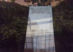 Φεύγοντας από το ανοιχτό γήπεδο του μπάσκετ (πρέπει να φτιαχτούν τα διχτάκια - έχουν κοπεί) είδαμε μέσα στο σκοτάδι πίσω από τους καδούς σκουπιδιών ξεχασμένη και ξεβαμένη την πινακίδα, που λέει κάτι για το γήπεδο ποδοσφαίρου και το επι ποιού δημαρχία έγινε.