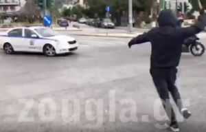 Τα άτομα αυτά πέταξαν αντικείμενα σε διερχόμενο περιπολικό, το οποίο κάνοντας αναστροφή στη νησίδα του δρόμου τράπηκε σε φυγή.