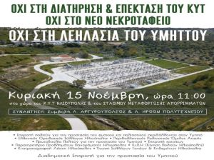 4. Η Κυβέρνηση επιτρέπει τη δημιουργία νεκροταφείων στον Υμηττό, και ο Δήμαρχος, μειοψηφικά προς το παρόν, ζητά διαδημοτικό νεκροταφείο στην περιοχή του ΚΥΤ. Εμείς υποστηρίζουμε την κατά πλειοψηφία απόφαση του Δημοτικού Συμβουλίου για την μη δημιουργία νεκροταφείου σε δασικό και αναδασωτέο χώρο. Όπως αποδεικνύεται υπάρχουν άλλες προτάσεις, ενώ μακροπρόθεσμα λύση είναι η προώθηση της, διεθνώς αλλά και ήδη εδώ ισχύουσας, εθελοντικής δυνατότητας καύσης των νεκρών.