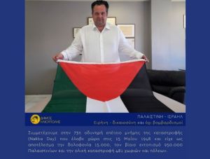Ο Πρέσβης του Κράτους της Παλαιστίνης κ. Marwan Toubassi με ευγενική επιστολή του, μας ζήτησε να συμμετέχουμε στην 73η οδυνηρή επέτειο μνήμης της καταστροφής (Nakba Day) που έλαβε χώρα στις 15 Μαΐου 1948 και είχε ως αποτέλεσμα την δολοφονία 15.000, τον βίαιο εκτοπισμό 950.000 Παλαιστινίων και την ολική καταστροφή 481 χωριών και πόλεων.