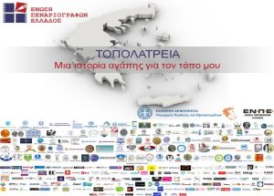 Με τρεις όμορφες και ξεχωριστές φωτογραφίες του τόπου σας (ή της προσωπικότητας ή της ιστορίας που θα επιλέξετε , οι οποίες μπορεί να έχουν τραβηχτεί ακόμη και από το κινητό σας τηλέφωνο και μια ιστορία για ό,τι προβάλλεται από αυτές (1 σελίδα το πολύ), μπορεί να είσθε εκείνος ή εκείνη που θα κληθεί να γράψει το πλήρες σενάριο (επ' αμοιβή) και να σκηνοθετήσει ένα promo (διαφημιστικό 3΄λεπτης διάρκειας) σε παραγωγή της Ένωσης Σεναριογράφων Ελλάδος, με τίτλο ΤΟΠΟΛΑΤΡΕΙΑ ώστε να αναδειχθεί η ιδιαιτερότητα του τόπου και η μεγάλη αγάπη σας για αυτόν.