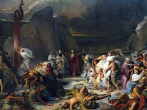 Ο πίνακας του Bruni δείχνει το αποκορύφωμα αυτής της ιστορίας. Φίδια πέφτουν από τον ουρανό, φοβίζοντας τους ανθρώπους.