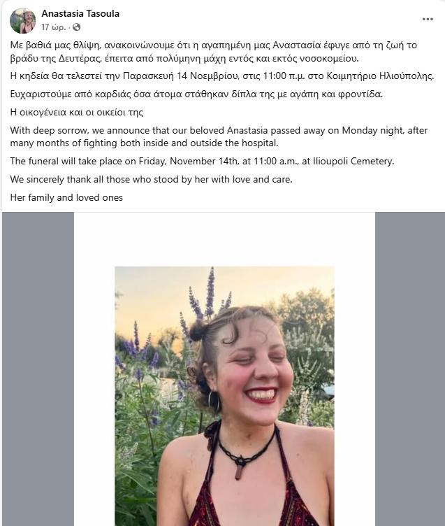 «Με βαθιά μας θλίψη, ανακοινώνουμε ότι η αγαπημένη μας Αναστασία έφυγε από τη ζωή το βράδυ της Δευτέρας, έπειτα από πολύμηνη μάχη εντός και εκτός νοσοκομείου.
