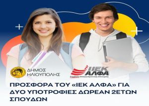 Με μια ευγενική κίνηση προς τον Δήμο Ηλιούπολης, το «ΙΕΚ ΑΛΦΑ» προσφέρει 2 υποτροφίες σε ενδιαφερόμενους να σπουδάσουν δωρεάν, σε κάποιο από τα διετή προγράμματα σπουδών του.