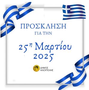 Ο Δήμαρχος Ηλιούπολης κ. Ευστάθιος Ψυρρόπουλος σας προσκαλεί να τιμήσετε με την παρουσία σας τις εκδηλώσεις για τον εορτασμό της Εθνικής Επετείου της 25ης Μαρτίου 1821.