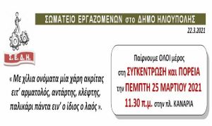 Το Δ.Σ. του ΣΩΜΑΤΕΙΟΥ μας, μαζί με τα υπόλοιπα σωματεία και φορείς της πόλης που συναντηθήκαμε στους πρόσφατους αγώνες και πετύχαμε την επαναλειτουργία των ιατρείων στο ΚΥ Ηλιούπολης, ΚΑΛΟΥΜΕ εργαζόμενους, σωματεία και φορείς να συμπορευτούν μαζί μας, στη συγκέντρωση και πορεία την ΠΕΜΠΤΗ 25 ΜΑΡΤΙΟΥ 11.30 πμ στην πλατεία Κανάρια, τηρώντας όλα τα μέτρα προστασίας (μάσκες, αποστάσεις).