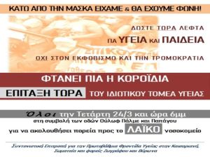 Σωματεία και φορείς των Ανατολικών Συνοικιών καλούν σε πορεία διαμαρτυρίας στο Λαϊκό Νοσοκομείο, την Τετάρτη 24/3 στις 06:00 μ.μ., με σύνθημα:
