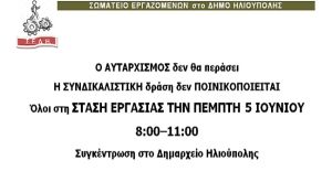 Καλούμε όλους τους εργαζόμενους του Δήμου Ηλιούπολης να συμμετέχουν μαζικά στη στάση εργασίας την Πέμπτη 5 Ιουνίου από 8:00 έως 11:00 και να δώσουν δυναμική απάντηση.