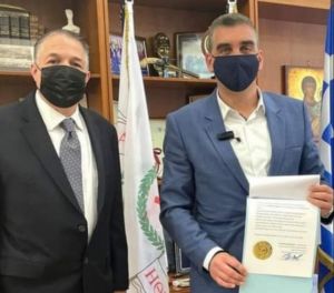 Φωτό: Ο Γερουσιαστής Λεωνίδας Ραπτάκης παραδίδει στο Δήμαρχο Ελληνικού Αργυρούπολης Γιάννη Κωνσταντάτο το Ψήφισμα για τη Γενοκτονία και την Επίσημη Πρόσκληση για να παρευρεθεί στην Αμερική