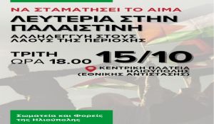 Απαιτούμε: Την άμεση υλοποίηση των αποφάσεων του ΟΗΕ για ελεύθερη Παλαιστίνη, τον τερματισμό των επιθέσεων του Ισραήλ και την απόσυρσή του από όλα τα εδάφη της Παλαιστίνης, του Λιβάνου και της Συρίας. Δεν ξεχνάμε την ομόφωνη απόφαση της ελληνικής βουλής - Δεκέμβρης 2015 , για την αναγνώριση ανεξάρτητου παλαιστινιακού κράτους , που έκτοτε έμεινε στα συρτάρια με ευθύνη όλων των κυβερνώντων.