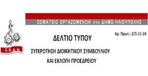 ΣΩΜΑΤΕΙΟ ΕΡΓΑΖΟΜΕΝΩΝ στο ΔΗΜΟ ΗΛΙΟΥΠΟΛΗΣ Αρ. Πρωτ.: 2/5-11-24 ΔΕΛΤΙΟ ΤΥΠΟΥ ΣΥΓΚΡΟΤΗΣΗ ΔΙΟΙΚΗΤΙΚΟΥ ΣΥΜΒΟΥΛΙΟΥ ΚΑΙ ΕΚΛΟΓΗ ΠΡΟΕΔΡΕΙΟΥ |