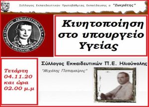 «Παρών» στην κινητοποίηση που διοργανώνει η ΕΛΜΕ Πειραιά, στο υπουργείο Υγείας, την Τετάρτη 4 Νοέμβρη, στις 2 μ.μ., δηλώνουν οι Σύλλογοι Εκπαιδευτικών Πρωτοβάθμιας Εκπαίδευσης «Ο Σωκράτης», «Ρόζα Ιμβριώτη» και Ηλιούπολης «Μ. Παπαμαύρος».