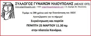 Καλούμε τις γυναίκες και τον λαό της Ηλιούπολης σε συγκέντρωση και πορεία, την ΠΕΜΠΤΗ 25 ΜΑΡΤΙΟΥ 11.30 πμ στην πλατεία Κανάρια.