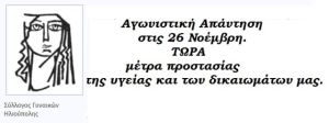 Ο Σύλλογος Γυναικών Ηλιούπολης καλεί τις εργαζόμενες, τις άνεργες, τις αυτοαπασχολούμενες της πόλης, τις νέες μητέρες, τις φοιτήτριες, τις συνταξιούχους να ενώσουμε τις φωνές μας με τα εργατικά σωματεία, τις Ομοσπονδίες και τα Εργατικά Κέντρα μπροστά στην απεργία της 26ης Νοέμβρη που έχουν προκηρύξει βάζοντας στην πρώτη γραμμή τις διεκδικήσεις μας για την προστασία της Υγείας, της ζωής, των δικαιωμάτων μας.