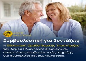 Η Εθελοντική Ομάδα Νομικής Υποστήριξης του Δήμου Ηλιούπολης διοργανώνει συναντήσεις συμβουλευτικής στήριξης για συμπολίτες και συμπολίτισσες, το Σάββατο 19 Μαρτίου 2022, από 12:00 έως 15:00, στην αίθουσα συνεδριάσεων του Δημοτικού Συμβουλίου «Κώστας Κονδύλης», με αντικείμενο: