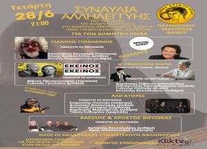 Συναυλία αλληλεγγύης και οικονομικής ενίσχυσης του Ηλιουπολίτη μουσικού Δημήτρη Πικέα και της οικογένειάς του θα πραγματοποιηθεί, υπό την αιγίδα του Δήμου Ηλιούπολης, την Τετάρτη 28 Ιουνίου 2023 στις 9:00 μ.μ. στο Δημοτικό Θέατρο Άλσους «Δημήτρη Κιντής» (Γαρδίκη & Σμόλικα) στην Ηλιούπολη.