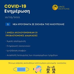 Σήμερα εντοπίστηκαν και επιβεβαιώθηκαν σε σχολεία της Ηλιούπολης τα παρακάτω 5 νέα κρούσματα και ήδη ακολουθούνται οι προβλεπόμενες διαδικασίες, δηλαδή άμεση απολύμανση, ενημέρωση οικογενειών, ιχνηλάτηση επαφών και αναστολή λειτουργίας των συγκεκριμένων τμημάτων, σύμφωνα με τις οδηγίες του ΕΟΔΥ: