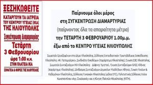 Με σύνθημα «ΤΟ ΔΙΚΑΙΩΜΑ ΣΤΗ ΖΩΗ ΚΑΙ ΤΗΝ ΥΓΕΙΑ ΕΙΝΑΙ ΣΤΑ ΔΙΚΑ ΜΑΣ ΧΕΡΙΑ» προετοιμάζονται τα Σωματεία και οι Φορείς της πόλης για την παράσταση διαμαρτυρίας που αποφάσισαν ομόφωνα να πραγματοποιήσουν την Τετάρτη 3 Φλεβάρη στη 1:00 μ.μ., έξω από το Κέντρο Υγείας Ηλιούπολης, με ασφάλεια και με την απαραίτητη προσοχή, παίρνοντας τα μέτρα προστασίας για την νόσο covid-19.
