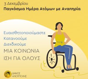 Η 3η Δεκεμβρίου καθιερώθηκε από τον Ο.Η.Ε, ως Παγκόσμια Ημέρα Ατόμων Με Αναπηρία, με στόχο να προωθηθεί η κατανόηση σε θέματα αναπηρίας αλλά και η κινητοποίηση υπέρ των δικαιωμάτων αξιοπρέπειας και ευημερίας των ατόμων με αναπηρία.