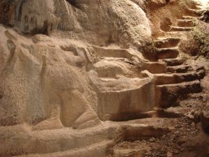 Υπάρχουν λαξευμένα σκαλοπάτια, επιγραφές και ανάγλυφες παραστάσεις.