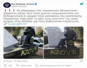 Σε μια οργισμένη ανάρτηση, η Ρωσική πρεσβεία στην Αθήνα, τονίζει «οι υπέρμαχοι του ουκρανικού εθνικιστικού τάγματος Αζόφ, που τόσα χρόνια τρομοκρατούσε και δολοφονούσε εν ψυχρό τους κατοίκους της ανατολικής Ουκρανίας, σήκωσαν το χέρι τους εναντίον της ιερής μνήμης στην Ελλάδα για τους Σοβιετικούς στρατιώτες – αυτούς οι οποίοι με τεράστιες θυσίες απελευθέρωσαν την σκλαβωμένη Ευρώπη από τον φασισμό στο Β’ Παγκόσμιο πόλεμο».