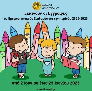 Ενημερώνουμε τους γονείς των βρεφών και νηπίων του Δήμου Ηλιούπολης ότι οι αιτήσεις εγγραφής για τη νέα Σχολ. Χρονιά 2025-2026, οι οποίες υπέχουν & θέση Υπεύθυνης Δήλωσης θα υποβάλλονται ΗΛΕΚΤΡΟΝΙΚΑ στη διεύθυνση του ιστότοπου https://ilioupoliaitiseisvn.tcloudapp.net για το χρονικό διάστημα από 02/06/2025 έως και 25 /06/2025 και ώρα 24:00.